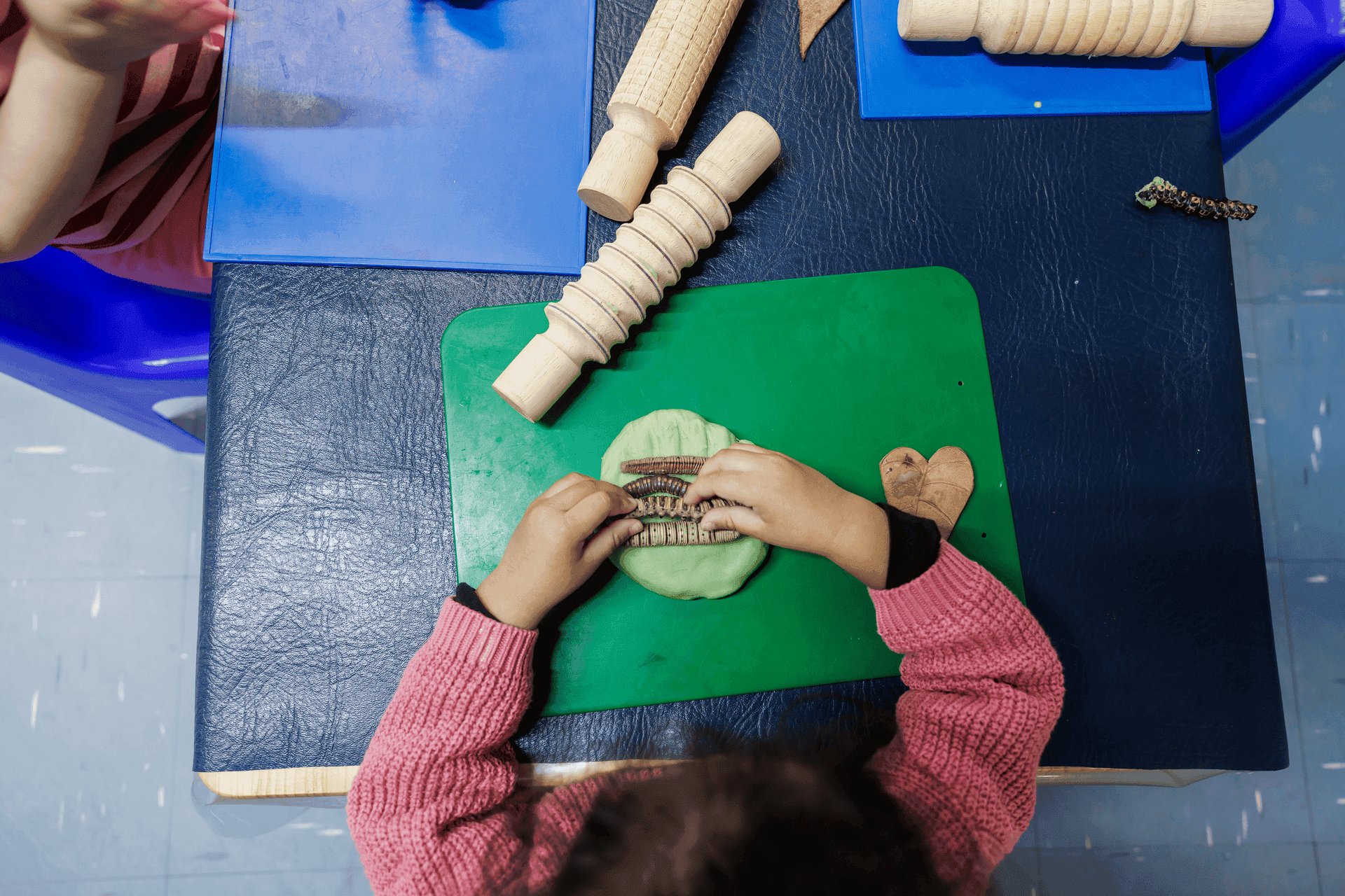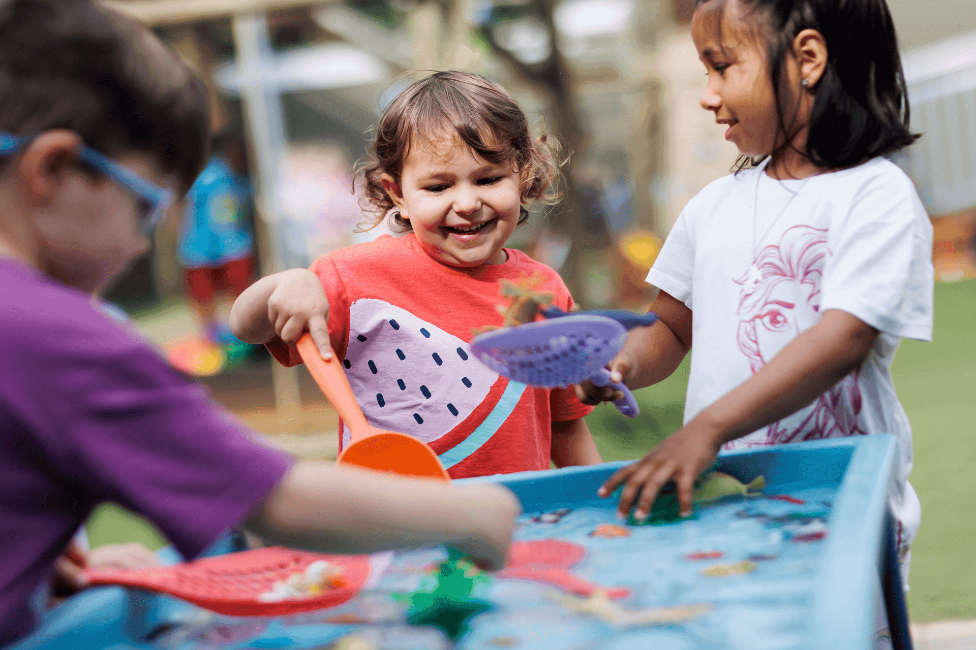 Water troughs, sensory trays, sandpit, and playdough.